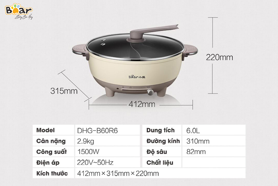 Nồi lẩu uyên ương Bear DHG-B60R6 được chế tạo từ hợp kim nhôm chất lượng cao chịu được nhiệt độ lến đến 1600ᵒC, bề mặt nhẵn mịn, chống mài mòn tốt, không gỉ, chống oxy hóa cao, đế PET cách điện và nắp kính cường lực cực bền.