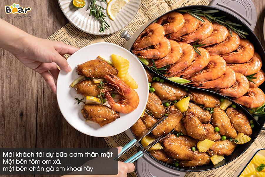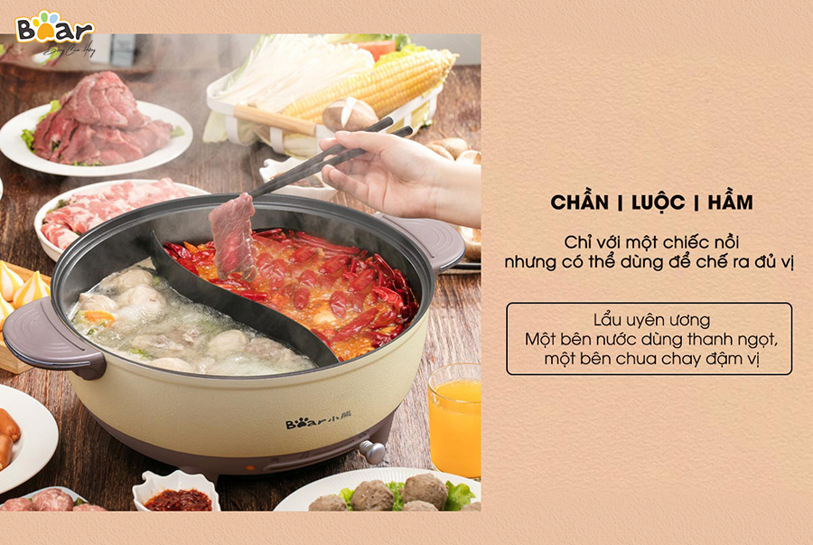 Nồi lẩu uyên ương Bear được trang bị công suất lên đến 1500W giúp làm nóng nhanh chóng, rút ngắn thời gian làm chín thức ăn. Bạn hãy tận hưởng bữa tiệc khôn gián đoạn với em nồi lẩu 2 ngăn chính hãng Bear công suất lớn nhé.