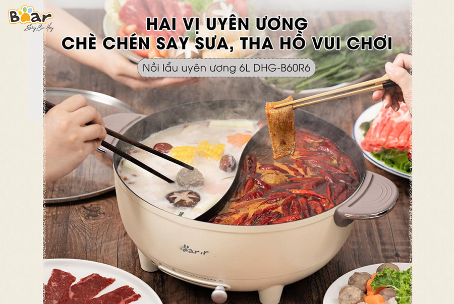 So với các nồi lẩu truyền thống chỉ có 1 ngăn thì nồi lẩu uyên ương Bear DHG-B60R6 cải tiến được thiết kế 2 ngăn rất tiện lợi. Bạn có thể dễ dàng chế biến 2 loại nước lẩu khác nhau, có thể là 1 ngăn lẩu thái chua cay, 1 ngăn lẩu hải sản ngọt bùi để các thành viên thoải mái lựa chọn khẩu vị phù hợp với mình. Bên cạnh đó, vách ngăn được thiết kế liền vào nồi, rất chắc chắn để đảm bảo 2 vị nước lẩu không bị trộn lẫn vào nhau và giữ trọn vị ngon ở từng ngăn.
